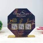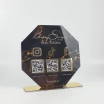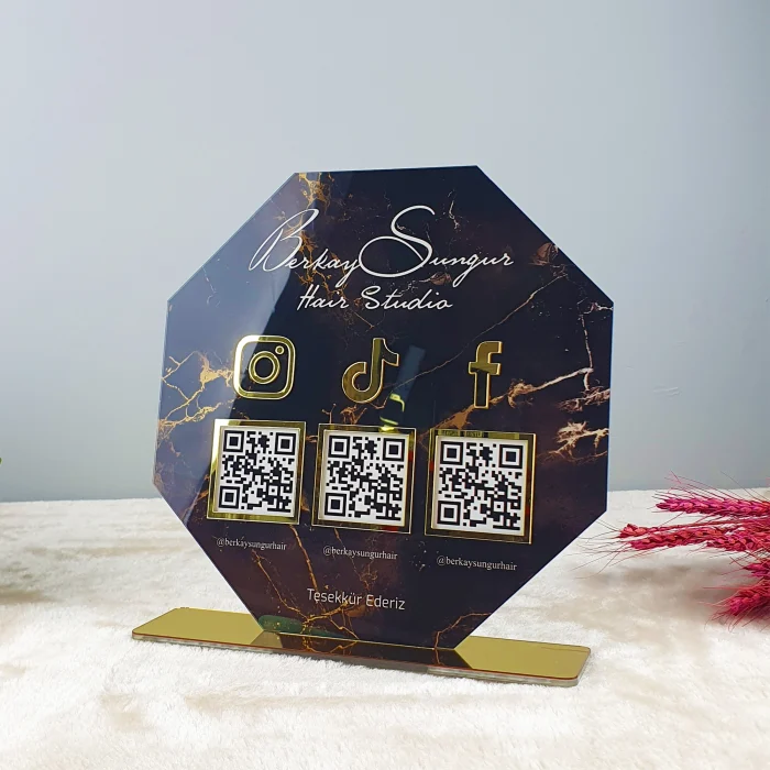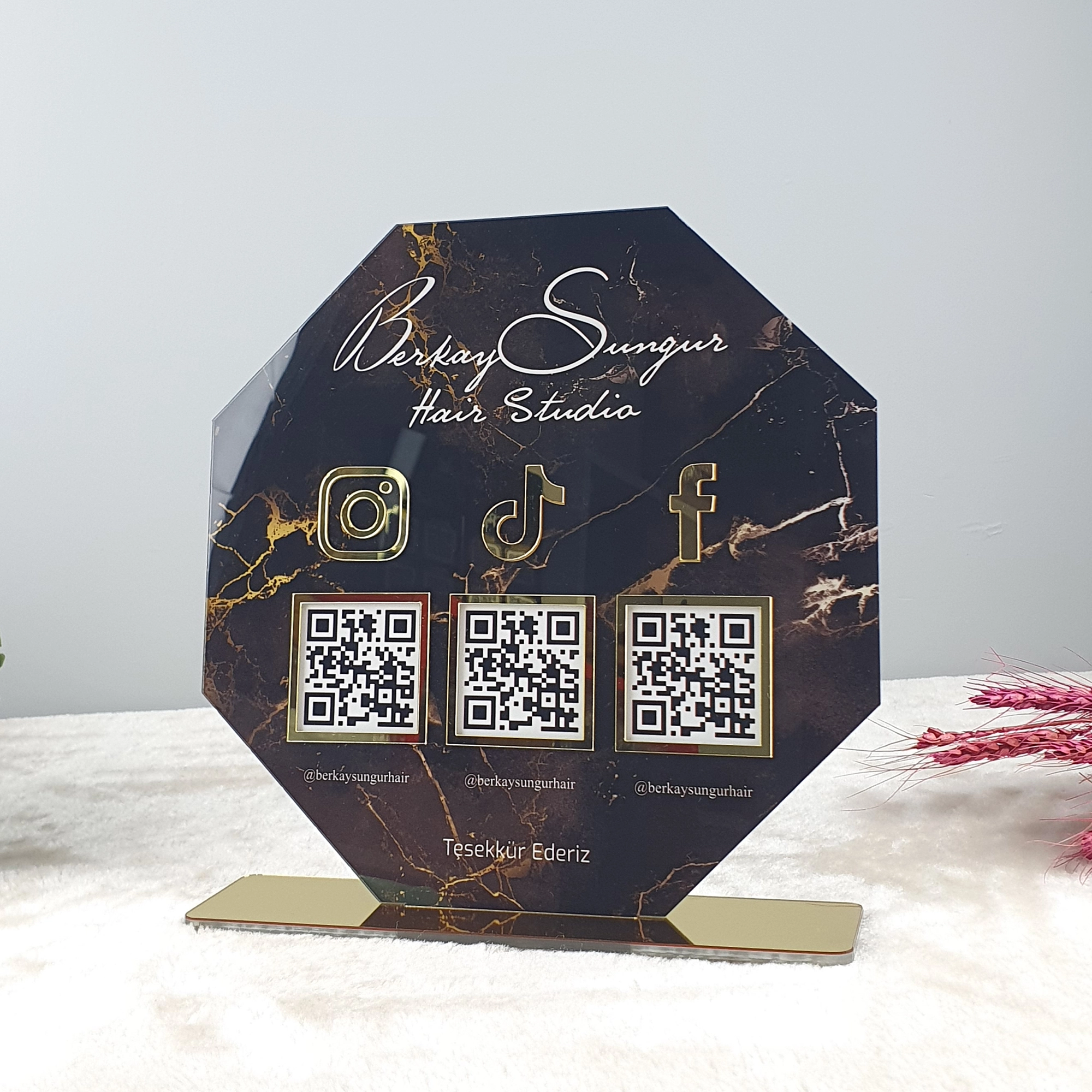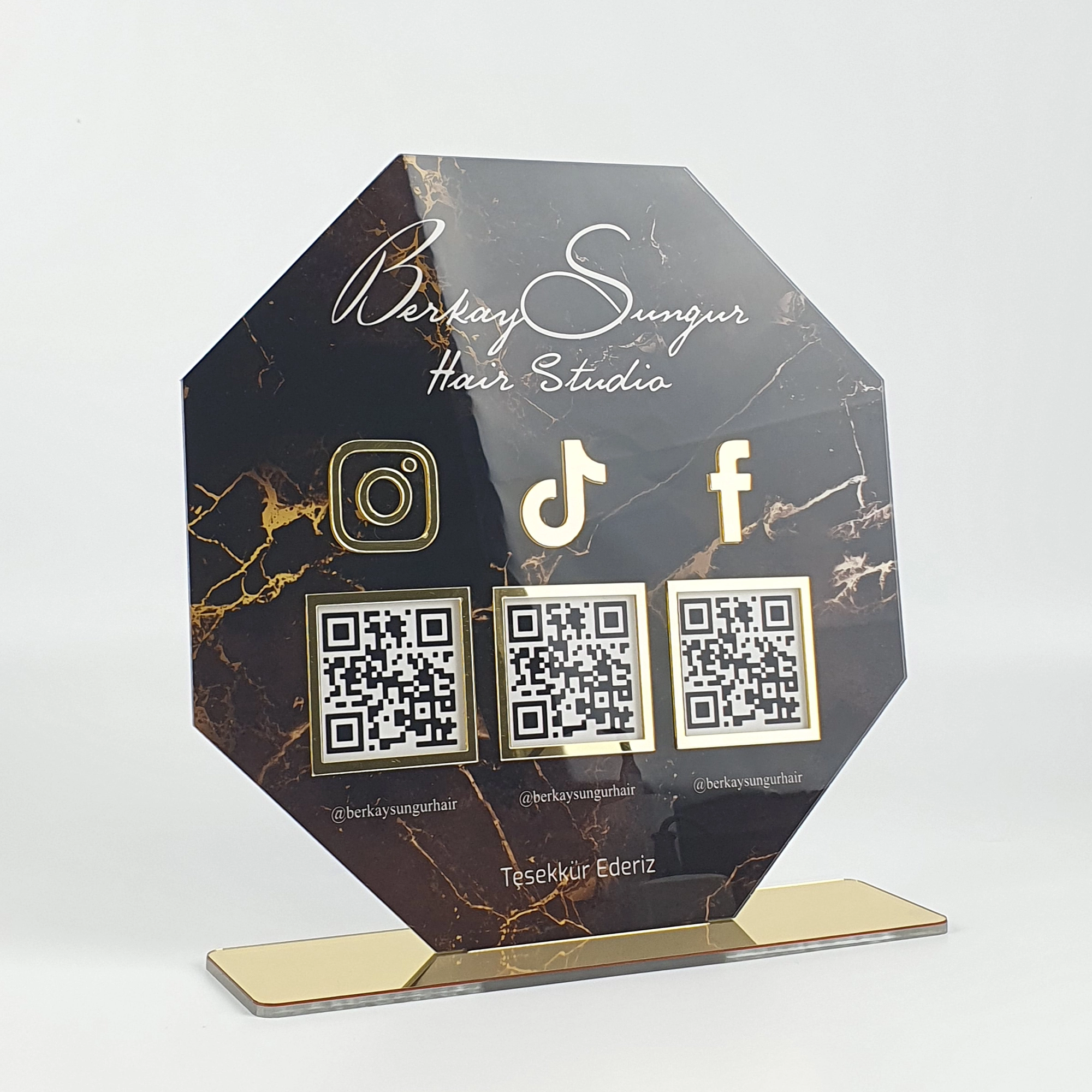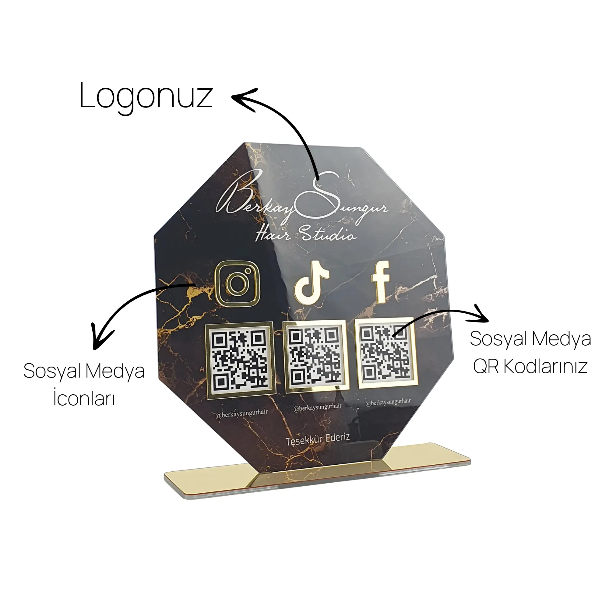 Tabela boyutları 22 x 22 cm olan sekizgen tasarımıyla dikkat çekici bir görünüm sunar. Yuvarlak şekli, mekânınıza modern bir dokunuş katarken, üzerinde yer alan üç QR kodu ise kolayca okunabilir ve etkili bir şekilde kullanılabilir.