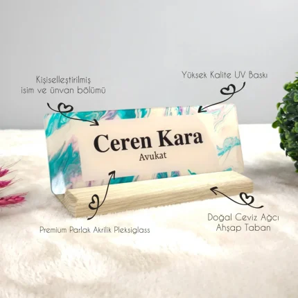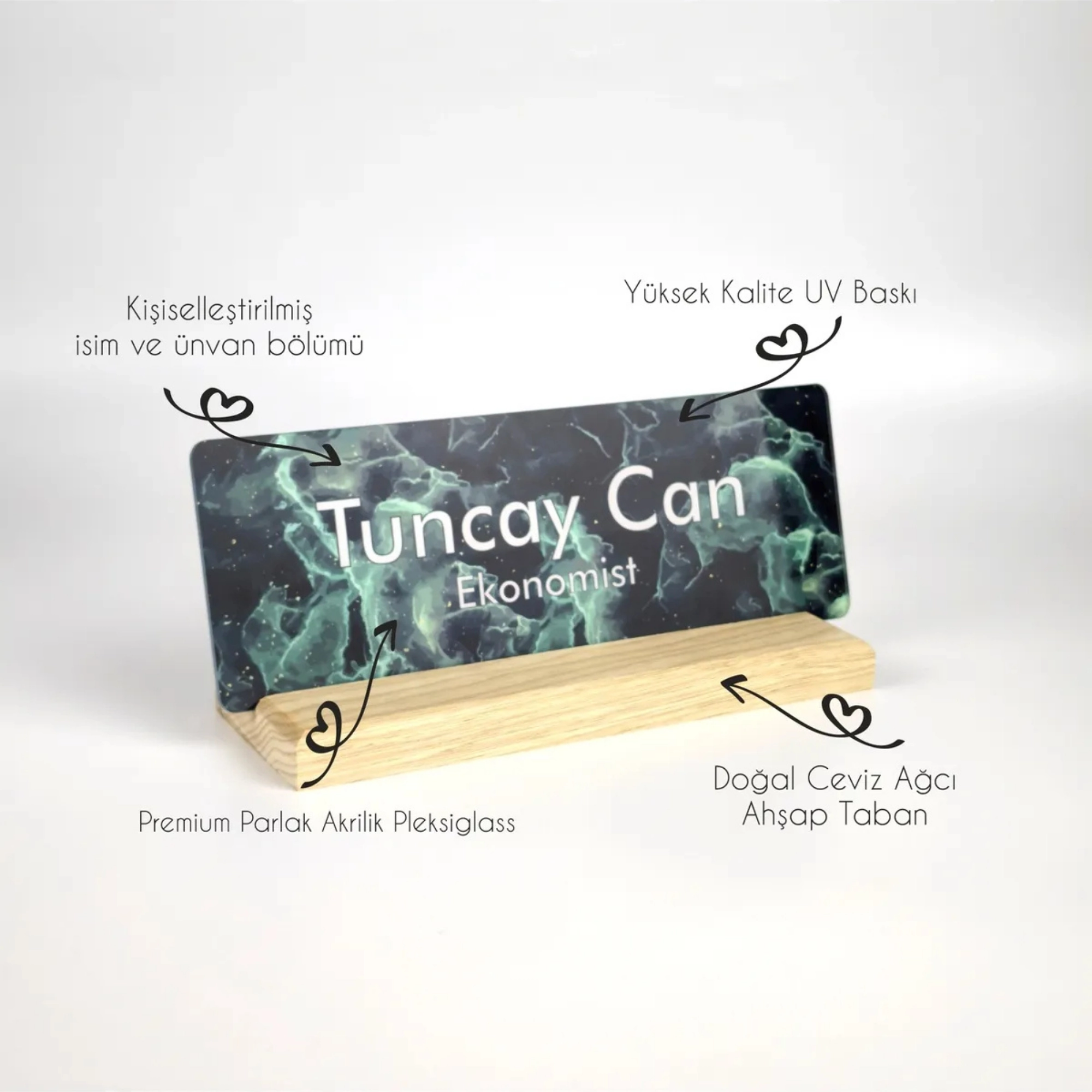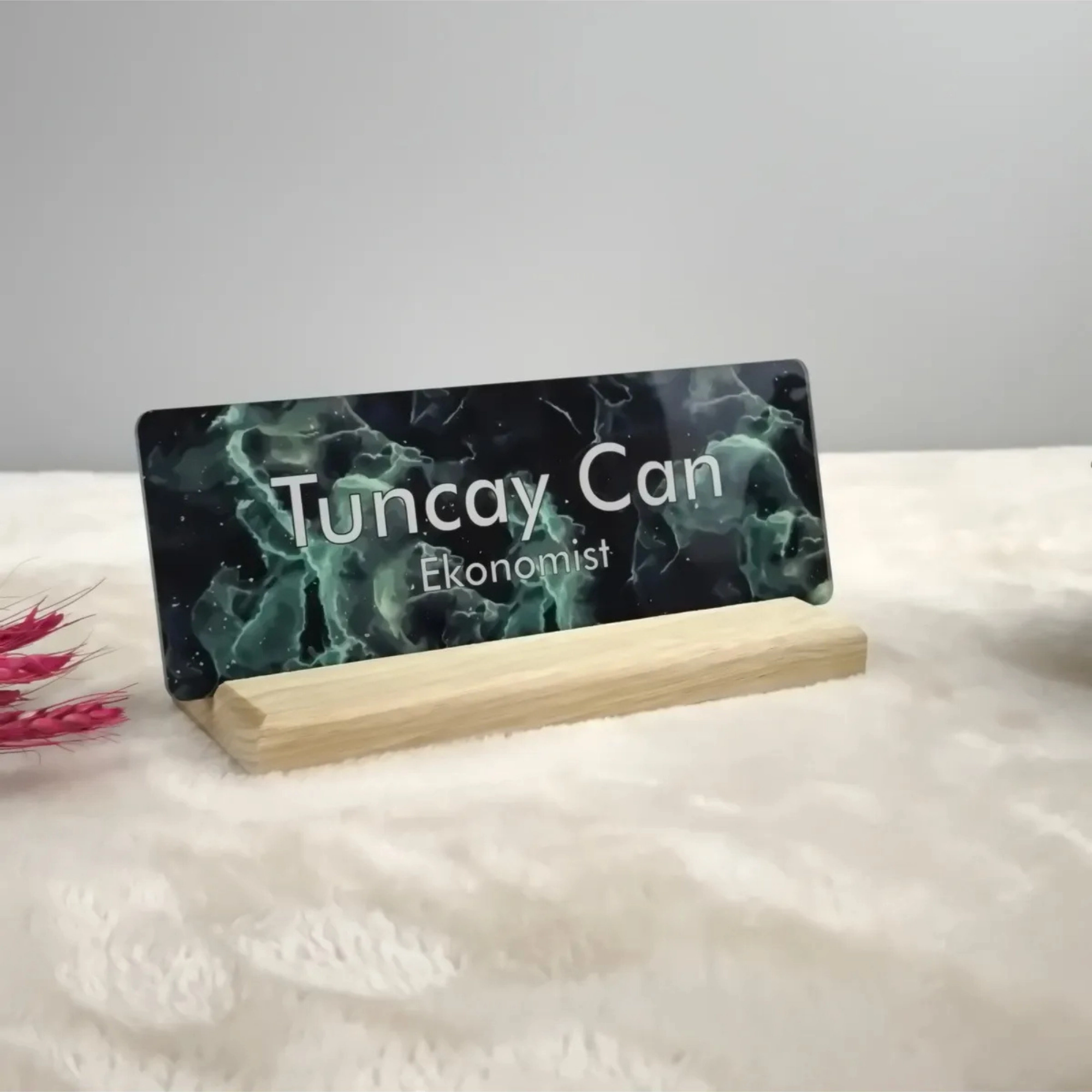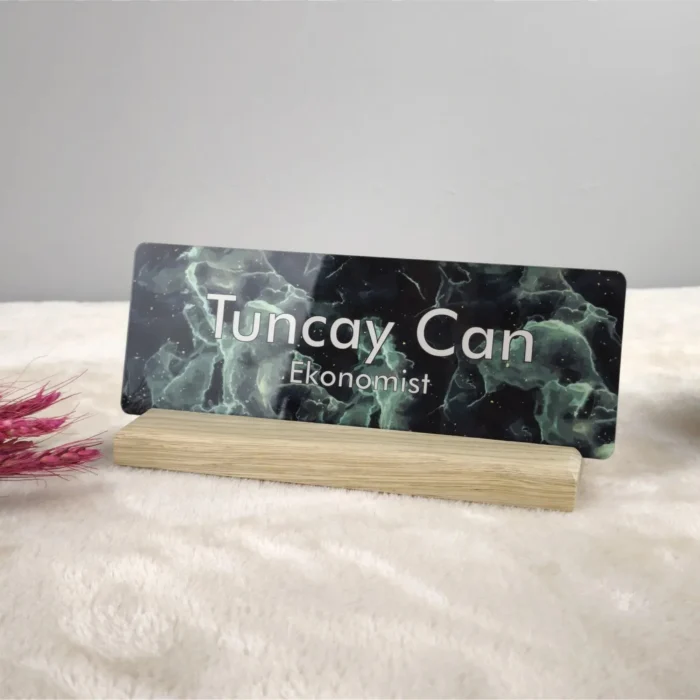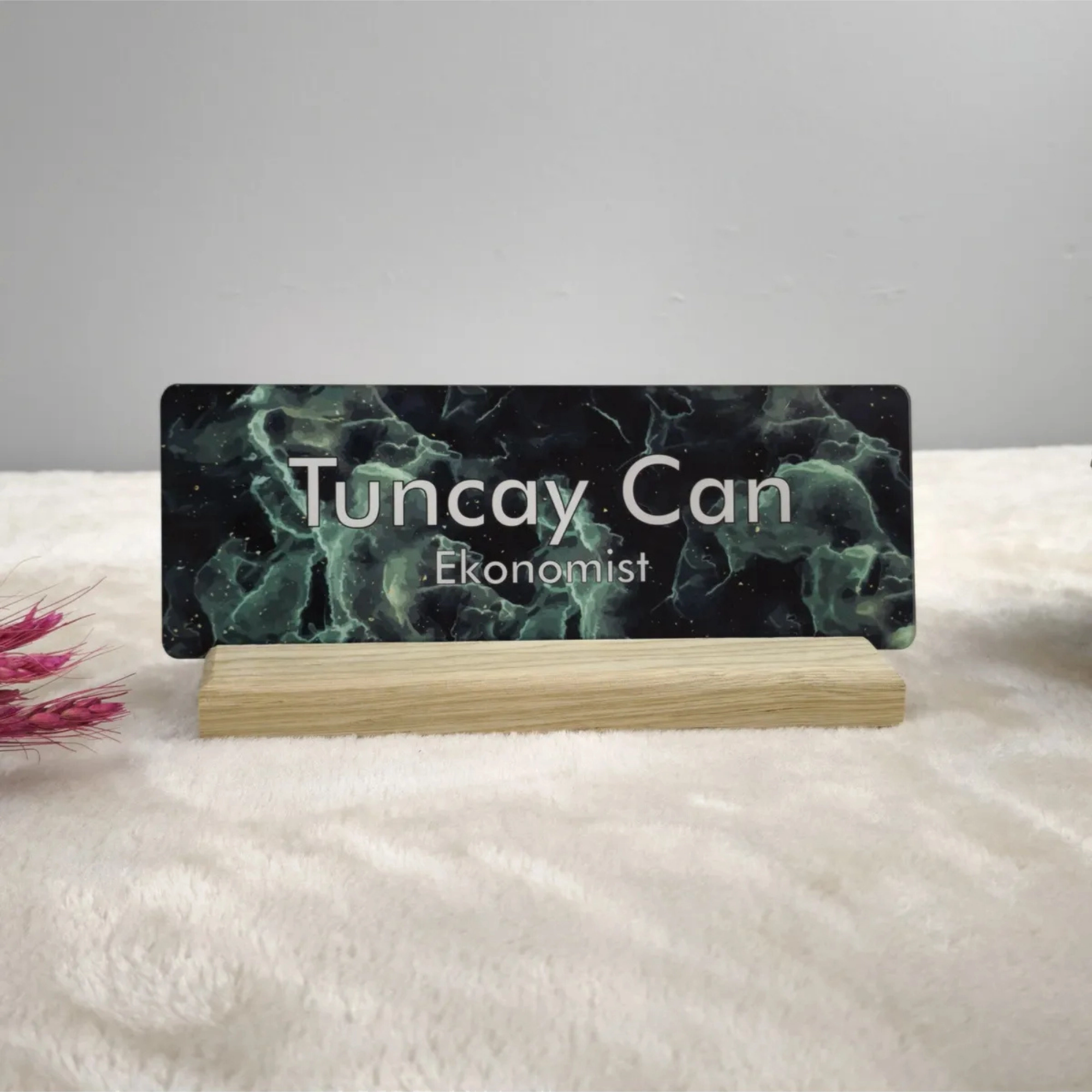 Zarif ve şık tasarımıyla çalışma alanınıza prestij katacak bu kişiye özel masa isimliği,  mermer deseniyle modern bir dokunuş sunar. Ahşap standı sayesinde sağlam bir duruşa sahiptir ve masanızda profesyonel bir hava yaratır. İsminiz ve unvanınız özel olarak işlenerek tamamen size özel hale getirilir.