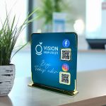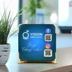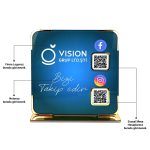 UV baskı teknolojisi sayesinde logo, not ve arka plan renkleri uzun süre canlılığını korur. QR kod alanları, Facebook ve Instagram gibi iki sosyal medya hesabınıza anında erişim sağlar. İşletmeler, ofisler, danışma masaları ve showroomlar için ideal bir tanıtım ürünüdür.