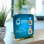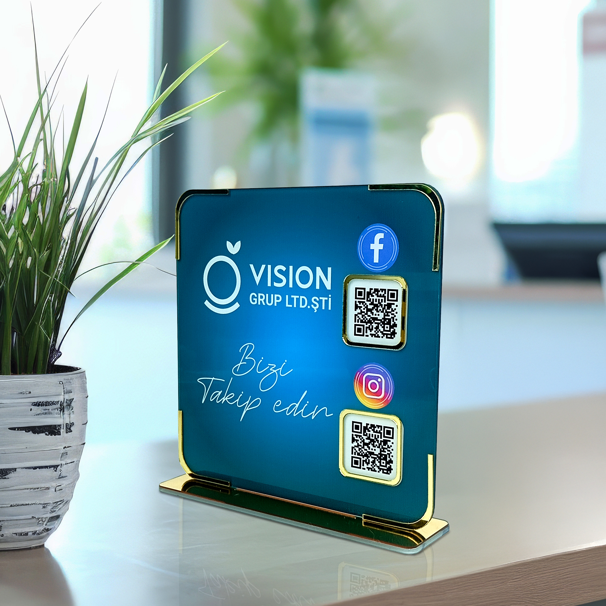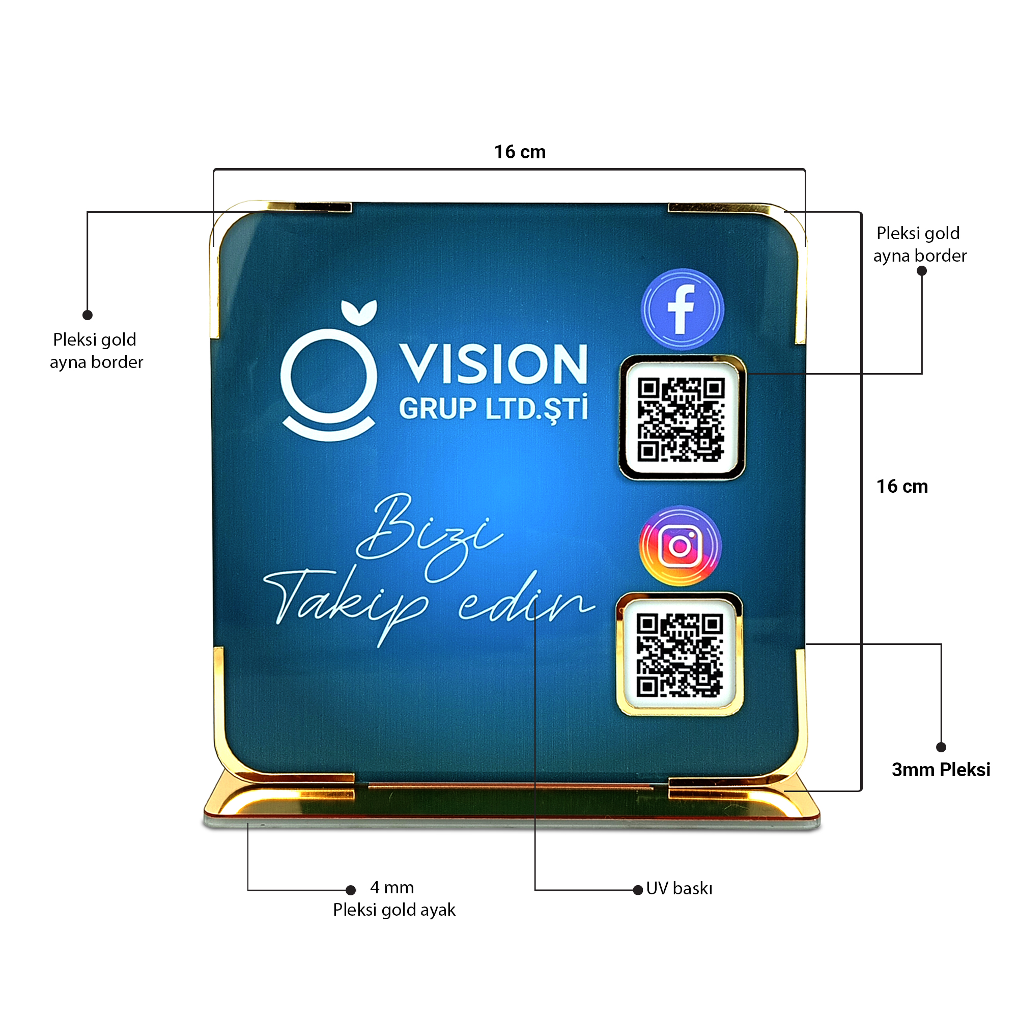 Gold ayna detaylarıyla güçlendirilmiş Plexi Sosyal Medya Display Standı, işletmenizin sosyal medya hesaplarını müşterilerinize şık ve modern bir şekilde sunmanızı sağlar. 3 mm plexi gövde, 4 mm gold mirror ayak ve UV baskı kalitesiyle uzun ömürlü, estetik ve tamamen kişiye özel bir tanıtım standıdır. Kurumsal logo ve QR kodlu yapısıyla masaüstünde dikkat çeken bir görünüm sunar.