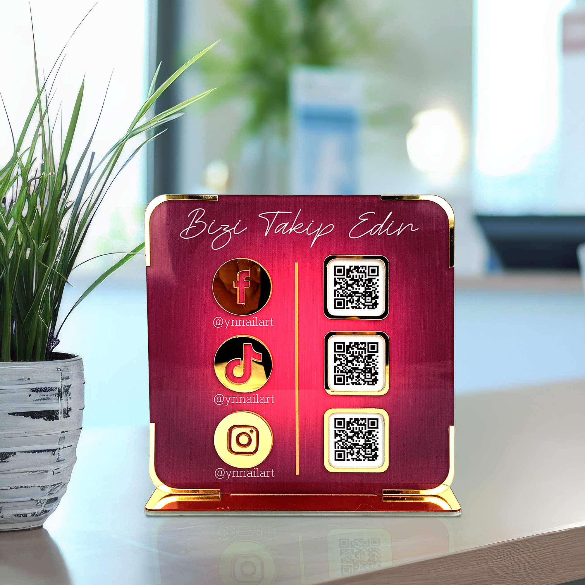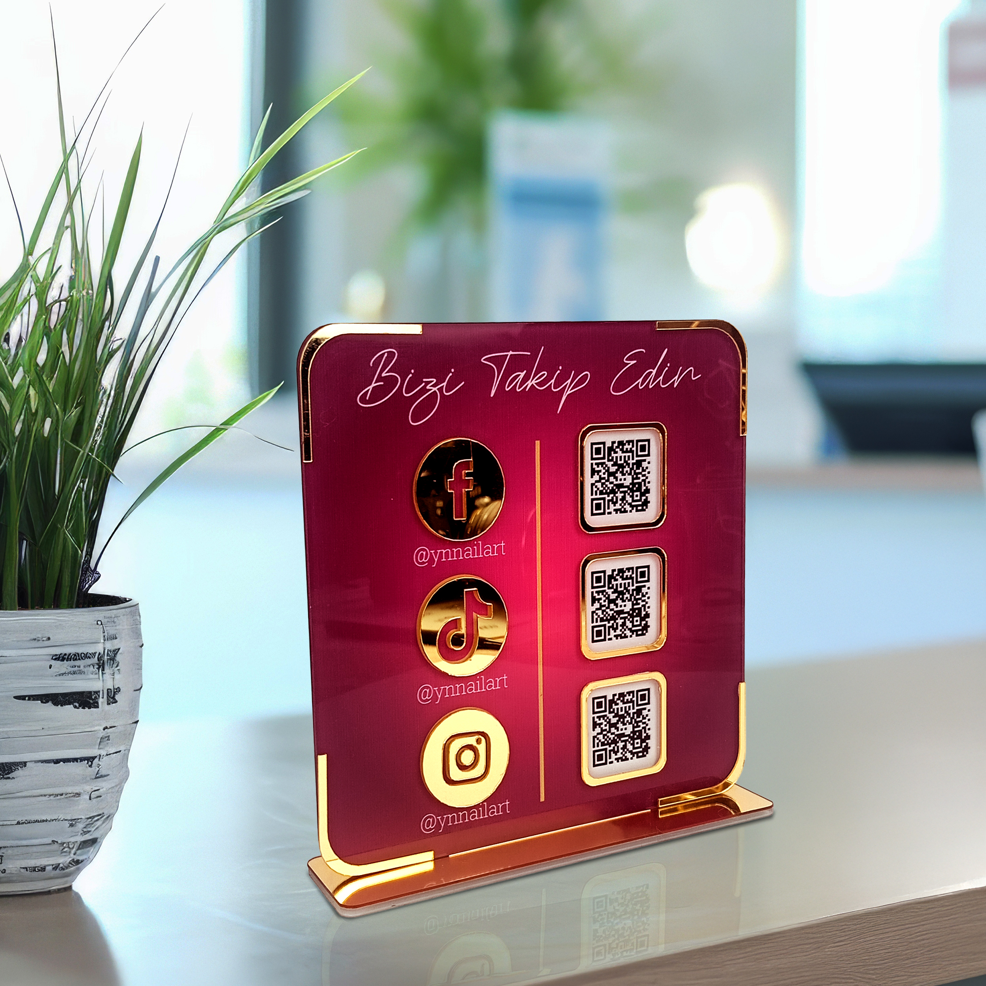 Şık tasarımı ve gold ayna detaylarıyla dikkat çeken Plexi Sosyal Medya Display Standı, işletmenizin sosyal medya hesaplarını müşterilerinize en estetik şekilde sunmanız için özel olarak üretilmiştir. 3 mm plexi gövde, 4 mm gold mirror ayak ve UV baskı teknolojisiyle hem dayanıklı hem de göz alıcı bir görünüm sağlar. QR kod alanları ile hesaplarınıza anında erişim imkânı sunarken, kişisel notunuzu ekleyebileceğiniz özel alanıyla tamamen size özel bir dokunuş kazandırır.