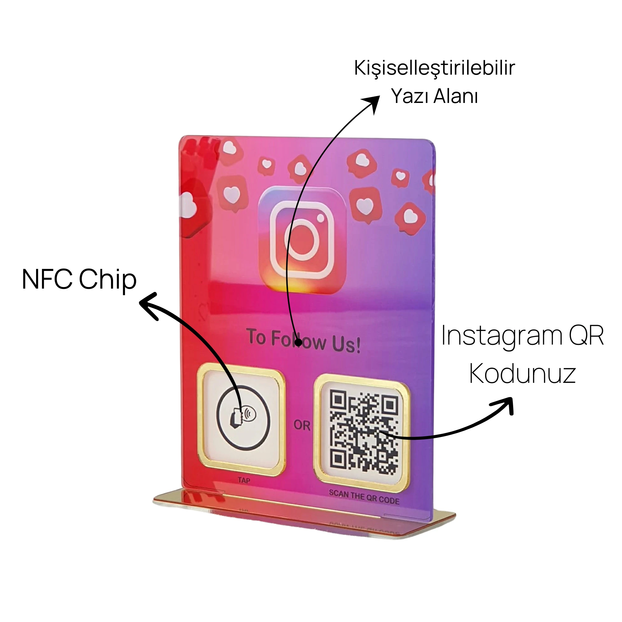 Bu şık ve işlevsel Tek QR Kodlu NFC Destekli Instagram Tabela, iş yerinizdeki tüm ihtiyaçlara hitap etmek üzere özel olarak tasarlanmıştır. Şeffaf pleksi malzeme üzerine yapılan yüksek kaliteli dijital baskı ile tabela, hem dayanıklı hem de estetik bir görünüme sahiptir.